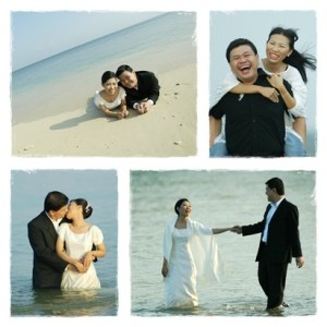 Pulang dari sana, kami foto-foto lagi di pantai area hotel yang putih bersih dan salah satu hasilnya adalah foto kami tiduran gaya duyung di pantai. Pokoknya kami diliatin orang-orang karena pakai jas dan gaun, ber-make-up, tapi basah kuyup dan berpasir. Walau begitu hasilnya keren khan ?? Yah, dari sini kami mulai melihat bahwa “cerita” di balik suatu foto atau destinasi itulah yang lebih menarik. Orang yang melihat fotonya hanya mengatakan “bagus yah, keren”. Tapi kami yang mengalami bisa tertawa mengingat cerita lucu bahkan juga beberapa pengorbanan yang harus dilakukan untuk bisa mendapatkan foto seperti itu.