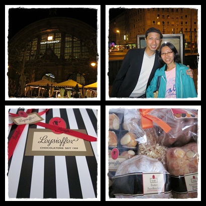 Tiba di stasiun kereta Frankfurt pukul 10 malam. Janjian ketemu sama James, teman SD Diana yang sudah puluhan tahun ga ketemu. Wah, kayak apa ya ?! Yeay… itu James yah ? Astaga, sudah beda sekali bentuk dan rupanya. Senang sekali bisa bertemu teman lama di negara asing ini. Selain membawakan tolak angin tablet pesanannya (ternyata produk luar negri pun tidak ada yang seampuh ini katanya), ternyata James pun memberikan bingkisan kue-coklat, khas Frankfurt katanya. Betul sekali, saudara-saudara… kue dan coklatnya enaaaaaak banget. Kami makan nya waktu di Belanda dan ada juga yang bisa dibawa ke Indonesia. Thanks a lot James for your time and the sweet souvenir !