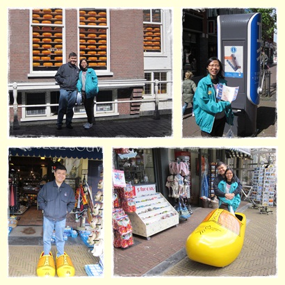 Kami melanjutkan perjalanan ke tempat souvenir. Di perjalanan, kami menemukan mesin otomatis untuk mengeluarkan peta Delft. Tinggal putar gagangnya dan dia akan mengeluarkan peta nya. Praktis sekali dan gratis. Bentuknya bisa dilihat di gambar, warnanya biru dengan lambang i (informasi). Kami juga sempat berfoto dengan background cheese (yg kuning pipih itu). Belanda memang terkenal sebagai penghasil keju juga.