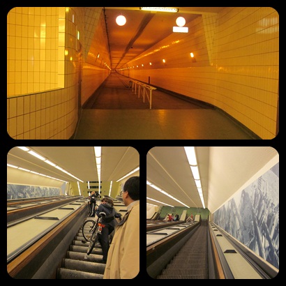 Panjangnya 585 meter, jadi ujungnya ga bakal keliatan dari ujung yang satu. Tingginya 17 meter. Dibangun tahun 1942. Untuk masuk ke terowongan ini (kami masuk ke jalur yang untuk orang tentunya), kami harus naik dan turun melalui eskalator yang curam banget dan panjang. Eskalator nya pun masih jaman kuno, pinggirnya pake kayu dan bunyi kriek kriek gitu. Terowongan pun sepi dan agak gelap. Kalo udah malem sendirian serem juga nigh. Untung aja kami ber-3, jadi ga gitu serem.