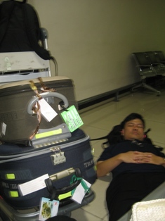 Sampe LCCT, kami segera mencari tempat duduk yang bisa dipakai untuk bisa beristirahat dan tidur. Hey ! Makin malam ternyata makin banyak calon penumpang yang pesawatnya baru berangkat besok pagi. Dan ternyata, sebagian dari mereka dengan santainya mengikat tali2 ransel mereka entah di tangan atau kaki mereka bahkan ada yang menjadikan ransel mereka bantal tidur agar tidak dicuri orang. Mereka pun tidur deh dengan nyenyaknya ! Ikutan ah. Seru juga juga di tidur bareng2 penumpang lain. Alhasil, lantai LCCT penuh dengan calon penumpang bergelimpangan untuk tidur malam dan petugas keamanan bandara pun tidak bisa berbuat apa2. Sudah biasa dan maklum rupanya.