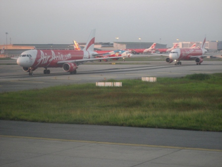 Akhirnya tibalah waktu berangkat. Ternyata delay cukup lama, tapi kami sudah berada di atas pesawat. Rupanya banyak pesawat Air Asia yang antri untuk terbang. Lucu juga pemandangannya. Hihi..