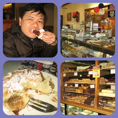 Hm.. Banyak macam dan besar2 sekali ukurannnya. Eh, bener loh. Rasanya enak dan nagih. Wah, Jeff sampai nambah. Untung bayang2 nilai tukar mata uang $AUS terhadap rupiah yang bikin bangkrut, menghentikan kami mencoba dalam jumlah lebih banyak 🙂 Tapi kenyang loh makan kue2 itu.