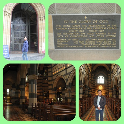 Sempat hujan sebentar, jadinya kami berteduh di katedral St. Paul sekalian lihat2 ke dalam gereja. Melbourne memang terkenal sebagai kota 4 musim. Maksudnya, dalam sehari bisa tiba2 hujan, tiba2 terang lagi, tiba2 dingin, dan tiba2 panas. Cuacanya betul2 tidak bisa diprediksi, berubah-ubah terus. Kami pun mengalaminya. Sebentar gerimis, sebentar terang, lalu angin kencang, lalu gerimis lagi. Haduh…