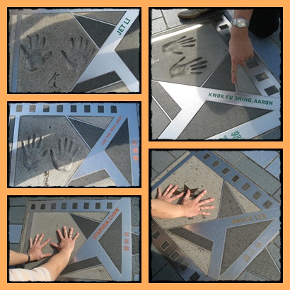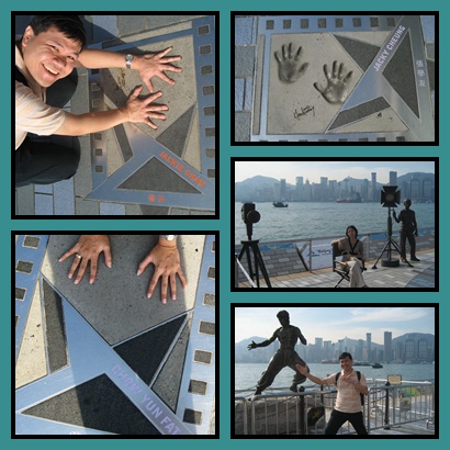 Ada patung Bruce Lee yang diperagakan dalam suasana syuting sebuah adegan film. Di tengah2 Avenue of Stars, ada toko kecil yang menjual merchandise yang berhubungan dengan Jacky Chan. Kami pun ikut berpose seolah-olah bintang film, hehe..