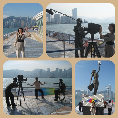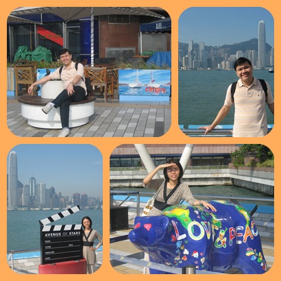 hk-6Tiba di stasiun Tsim Sha Tsui, kami bergegas naik ke atas stasiun melewati hotel dan mall untuk mencapai Avenue of Stars. Sesampainya di area Avenue of Stars, kami disuguhi pemandangan spektakuler. Langit biru dan bersih membentang dengan luas di hadapan kami. Ditambah pemandangan gedung2 pencakar langit yang terletak di sebrang lautan, yaitu di Hong Kong Island. Udaranya segar dan bersih ditambah dengan hawa air laut. Enak banget suasananya. We love it !