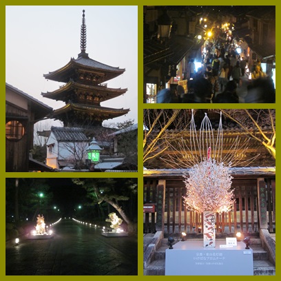Ada juga rangkaian bunga (Ikebana) yang cukup besar diletakkan di beberapa tempat. Menjelang malam, banyak sekali fotografer yang berusaha mencari spot terbaik untuk memotret Yasaka Pagoda. Sayang kamera kami yang sederhana ini sulit untuk bisa menangkap keindahan cahaya lampu pada malam hari. Tetapi memang mata yang Tuhan berikan kepada kami merupakan kamera paling fantastis yang bisa menangkap semua keindahan tersebut.