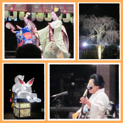 Ternyata tidak lama kemudian naiklah 2 orang perempuan muda berkimono dan 1 orang perempuan tua berkimono juga dan memegang alat music. Ooh… pertunjukan maiko dancing nih. Kereeeen ! Kami pun berusaha mencari spot untuk melihat tarian tersebut dan mengambil foto. Sayang sekali, sekeliling panggung sudah padat. Mata kami terhalang kerumunan orang dan tidak bisa melihat ke panggung. Akhirnya kamera saja yang dinaikkan untuk bisa mendapatkan gambar Maiko yang sedang menari tersebut.
