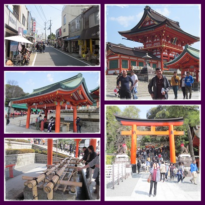 Sudah kenyang, kami pun lanjut masuk ke Fushimi Inari. Untuk masuknya gratis. Di bagian depan seperti biasa ada torii gate, lalu ada cedokan air tempat membasuh tangan/kaki dan minum. Cukup banyak yang berdoa/sembahyang, tetapi banyak juga yang hanya melihat-lihat.  Di sini banyak ditemui patung dan souvenir dengan bentuk fox / rubah.