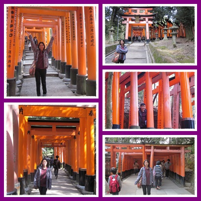 Fushimi Inari terkenal dengan torii gate nya yang berwarna orange dan berjajar sangat banyak (sekitar 10 ribu lebih). Di tiang2 orange tersebut ada tulisan nama para sponsor. Sedangkan di baliknya kosong. Jadi terserah, kita mau foto arah yang bertulisan atau yang kosong. Tiang2 itu juga ada yang pendek, ada yang tinggi.Kalo ada waktu, ingin rasanya naik sampai ke puncak bukit. Katanya pemandangannya indah. Sayang, waktu kami terbatas. Jadi kami langsung balik ke stasiun kereta untuk bertemu dengan teman Couchsurfing kami, namanya Ms. Maki Kaneshiro.