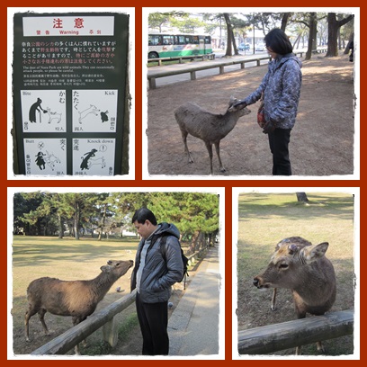 nara2Pagi ini kami berangkat ke Nara. Perjalanan kami tempuh dengan kereta Kintetsu Nara Rapid Express kurang dari 1 jam. Nara adalah kota kecil yang cantik di area Kansai, biasa dicapai dengan one day trip dari Osaka atau pun Kyoto. Nara terkenal dengan rusa yang banyak berkeliaran dengan bebas di taman kota. Jadi lambang kotanya Nara yah rusa. Patung manusia nya pun diberi tanduk supaya menyerupai rusa, hehe..