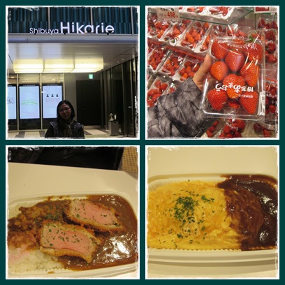 Oke, kami sih makan di lantai 1 saja ya. Pas ada meja kosong untuk duduk makan. Lunch kali ini berupa nasi kari dan omelet berbumbu kari juga. Di Jepang banyak makanan berbumbu kari juga loh, tapi rasanya beda dengan kari di Indonesia. Harga untuk 2 menu itu sekitar 800 yen. Rasanya tidak terlalu enak, porsi juga standard. Yah, buat ganjal perut aja deh. Sebab nanti malam kan pasti dikasi makan enak di airlines, hehe.. Sempat jalan2 sebentar di lantai itu dan ada jual buah2-an yang segar. Liat itu strawberry nya besar2 banget. Lebih besar dari jempol Diana tuh 🙂