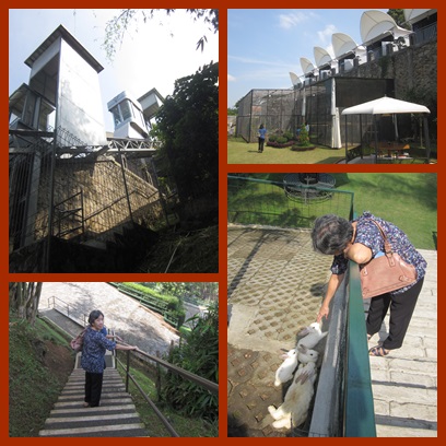 Untuk menuju adventure park, tempat kami bermain kemaren siang, kami memilih jalan kaki saja. Toh jalannya menurun. Turun tangga saja, asal hati2 sih oke kok. Eitss… ada sekelompok kelinci lagi nih di tepian tangga.. lucunyaaa…