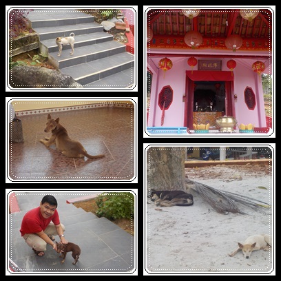 Yang menarik malah kami menemukan mama anjing dan anak2nya yang lucu2. Dari 3 anak anjing, ada 1 yang aktif dan berani dan 2 lainnya malu2. Mereka mengikuti kami dari mobil hingga naik ke area kuil yang terletak di atas bukit. Kelihatannya mereka lapar sekali. Jadilah kami memberi mereka makan roti yang langsung dimakan dengan berebutan, lahap sekali ! Sampe bingung, baru kali ini loh kami kasi makan roti2 ke anjing, dilempar dan langsung dilahap, kaya kasih makan ikan aja deh, astaga….