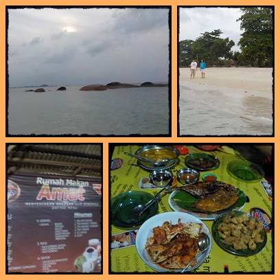 Menu makan siang kami adalah : ikan bakar, gangan kepala ikan, sate udang, cumi goreng tepung dan tumis kangkung. Gangan adalah makanan khas Belitung berupa sop ikan, berkuah kuning/orange, ada campuran nanas dan rasanya agak pedas. Rasa gangan tiap restoran atau daerah di Belitung bisa berbeda2 tapi kira2 rasanya asam pedas. Yang umum digunakan untuk gangan adalah ikan ketarap. Sea-food nya fresh, jadi enak. Makanan di Belitung memang bernuansa sea-food, jadi buat yang alergi sea-food atau vegetarian bakal sengsara deh di sini, hehe..