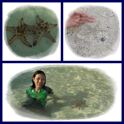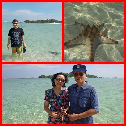 Ada juga nih 2 ekor bintang laut seperti yang tadi di pulau pasir. Kami pose dulu deh dengan mereka. Ketemu juga bintang laut yang masih muda, warnanya hampir sama dengan pasir.