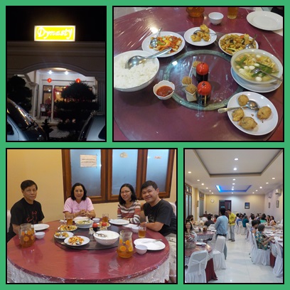 Makan malam di Dynasty, restoran Chinese food terbesar di Belitung yang punya hall besar untuk acara2, terpisah dari tempat makan yang untuk tamu biasa. Pada saat kami datang, ternyata sedang ada resepsi pernikahan orang Tionghoa Belitung, seru juga. Kami makan di bagian samping gedung resepsi dengan tamu2 biasa yang lain. Makanannya bisa lihat sendiri di foto. Ada ketam/kepiting isi, makanan khas Belitung juga, enaaak banget ! Kali ini disediakan juga buah potong sebagai penutup.