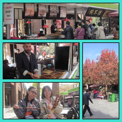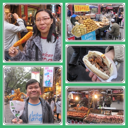 Kami mencoba : sate kambing RMB 10/tusuk (lebih mahal dan tidak seenak yang di area Terracota Warrior), squid satay RMB 20 per pcs (besar, rasanya gurih asin), kue kuning kayak bika ambon RMB 3 per pcs (ternyata kue ketan, dikasi olesan selai, kami ga doyan) dan terakhir pisang goreng RMB 10 (ini paling enak menurut kami, pisangnya manis, tepungnya crispy dan diolesi oleh selai strawberry). Tante Caroline mencoba juga kebab isi daging yang antrian belinya panjang sekali. Memang enak !