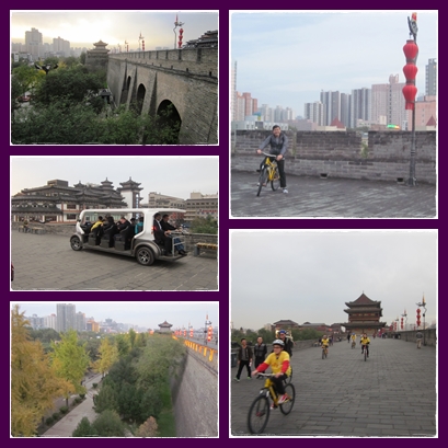 Karena sore hari, kami bersepeda sambil menikmati suasana matahari mulai terbenam yang sangat cantik di atas tembok. Pemandangan dari atas tembok sangat mempesona. Bisa melihat kota di dalam tembok dan di luar tembok, bangunan khas China maupun yang modern. Belum lagi pohon2 musim gugur yang berwarna kuning. Keren ! Kami sangat menikmatinya.
