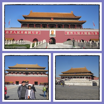 Kami naik subway lagi dan turun di station Tiananmen West. Penjagaan oleh pihak keamanan terlihat sangat mencolok. Baik tentara, polisi maupun petugas berpakaian preman, ada dalam jumlah yang cukup banyak. Terlihat foto presiden RRC pertama Mao Zedong. Orang ramai sekali di sini.
