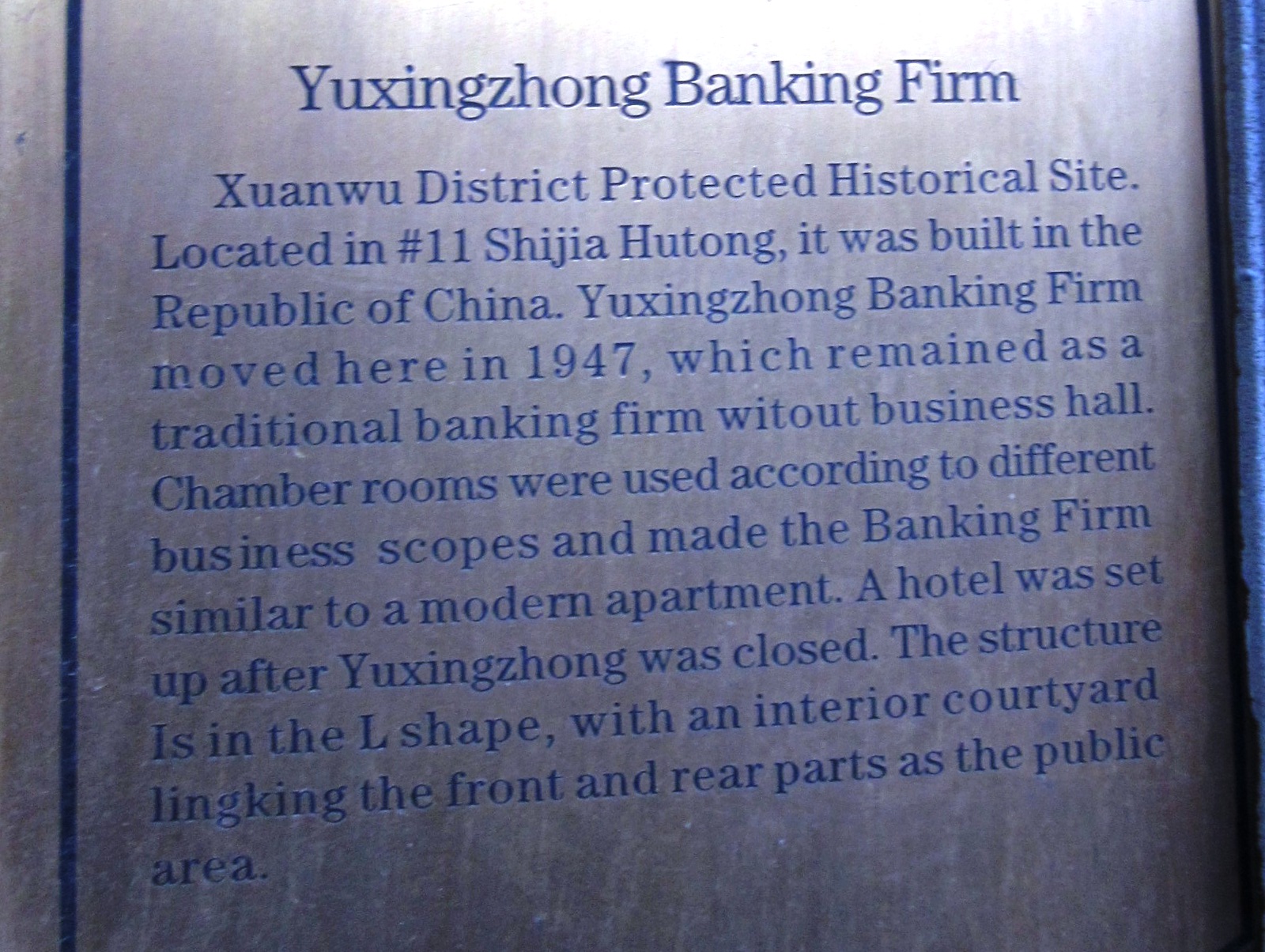 Biasanya yang dijadikan tur adalah hutong yang dekat dengan Forbidden City. Kalo yang kami tinggali adalah kawasan tua yang dilestarikan. BeiJing Hyde Hotel ini bukan sembarang hotel. Di masa lampau, bangunan ini adalah sebuah bank. Lalu beralih fungsi menjadi hotel. Jadi semacam bangunan cagar budaya yang perlu dipelihara dan dilestarikan oleh pemerintah.
