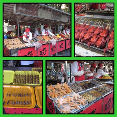 Di sini harga makanan ekstremnya mahal2. Udah butuh nyali gede, butuh duit gede juga. Benar2 ‘penyiksaan’ he..he.. Satu tusuk sate ulat sutra yang bentuknya kecil2 itu saja, harganya RMB 20. Makan di sini hanya buat gaya difoto ha…ha…