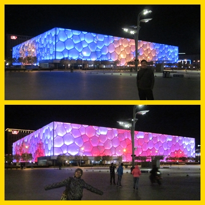 Yang menarik adalah bangunan National Aquatic Center atau disebut Water Cube. Eksteriornya seperti gelembung2 air. Saat malam hari, lampu2 di gelembung2 air itu berubah warna terus. Kadang merah, kadang biru. Cantik jadinya.
