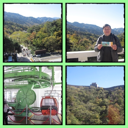 Dari loket beli tiket cable car, jalannya menanjak terus sampai tiba di tempat cable car. Kalo ga biasa olah raga atau gerak badan, pasti banyak berhentinya. Naik cable car hanya 5 menit. Akhirnya tiba deh di atas Great Wall, di benteng no 14. Di situ sudah ramai orang. Pemandangan dari atas sini, bagus sekali. Baik liukan Great Wall-nya maupun pemandangan alamnya. Apalagi ini pas musim gugur, jadi ada warna semu kuning dan merah daun2 pohon di kejauhan.