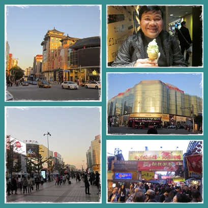 wangfujingSesudah itu, kami masuk ke area pedestrian Wangfujing. Mobil tidak boleh masuk. Di kanan kiri, berdiri megah pusat2 perbelanjaan alias mall. Modern dengan merk2 papan atas. Kami kemudian mampir sejenak ke Mc.Donald.  Beli es krim green tea untuk menetralisir rasa makanan ekstrem.