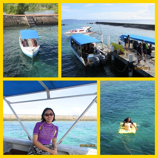 Ga terasa, kami snorkeling di titik ini sekitar sejam. Wow ! Soalnya tenaga sudah fresh lagi sih, tadi kan habis makan siang, hehe.. Ternyata kami sudah terbawa arus cukup jauh dari titik awal snorkeling kami. Awalnya mulai di sekitar muka kampung dan berakhir di sekitar Lekuan 1. Oke, sudah cukup !