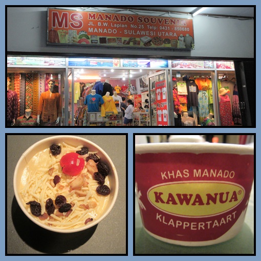 Di toko ini juga dijual salah satu makanan khas Manado yang terkenal yaitu klappertaart. Ada yang ukuran cup kecil dan ada yang besar berbentuk loyang. Karena kami mau beli untuk dibawa pulang dan juga oleh-oleh, maka kami beli yang cup mini saja. Praktis. Merknya Kawanua, diklaim yang paling enak dan memang enak banget sih rasanya !