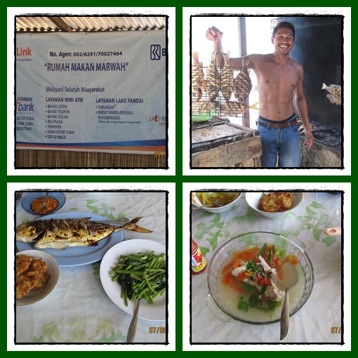 Kami diajak pak John ke tempat makan yang paling besar di bagian pantai paling kanan (menghadap pulau). Namanya rumah makan Marwah. Karena kenal dengan pemiliknya, pak John membawa kami masuk ke dalam dapurnya. Kami bisa melihat dan memilih langsung ikan yang hendak disantap. Ada beberapa jenis ikan, kami pilih ikan bobara yang khas Manado. Ikannya cukup besar dan dagingnya tebal.