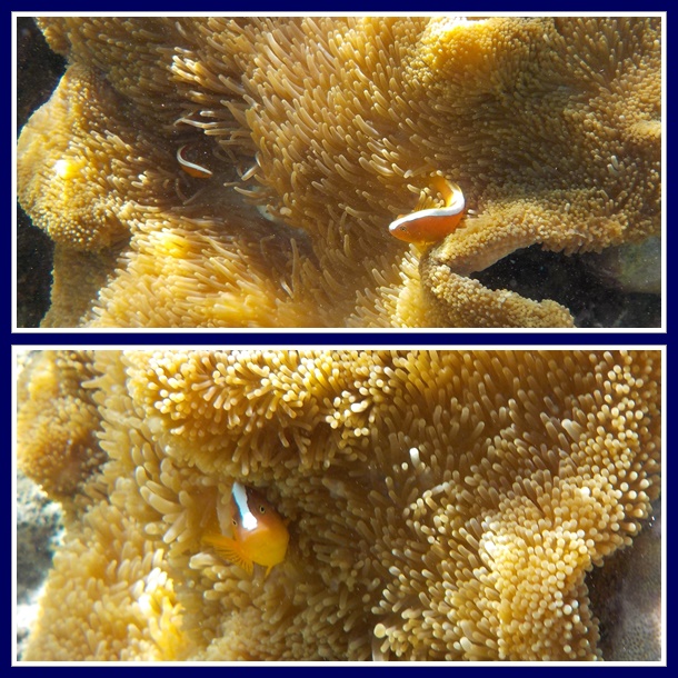 Tak lama snorkeling, kami menemukan ikan nemo (ikan badut/clownfish). Kami sudah lama cari2 ikan ini karena biasanya dia banyak bersembunyi di anemon dan belum punya fotonya. Tadi memang sudah ketemu clownfish di Lekuan 3, tapi yang tadi jenis strip nya lain.