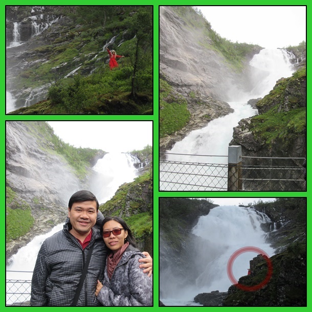 Tidak lama kemudian, kereta berhenti di Kjosfossen, air terjun besar sekali dan penumpang bisa turun sekitar 10 menit. Ada wanita bergaun merah, cukup menyolok warnanya walaupun tetap terlihat sangat kecil bila dibandingkan dengan air terjun di belakangnya. Lihat yang lingkaran merah di foto samping.