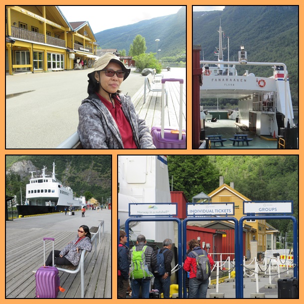 Sudah puas ! Waktunya melanjutkan perjalanan. Kami pulang ke hostel untuk mengambil ransel dan bagasi, serta kembali lagi ke pelabuhan tempat kami menunggu keberangkatan kapal kami. Saat tiba di pelabuhan Flam, sudah mulai terlihat antrian orang yang mau naik ferry. Ada 3 jalur antrian, jalur pemegang ticket NiN, jalur individu dan jalur group. Jika kemaren sore yang panjang itu antrian NiN (yang 2 lainnya kosong), kali ini yang antri justru jalur individu (2 lainnya kosong). Kami pun antri di situ, tapi antriannya bisa dibilang sangat sedikit, jauuuuuh dibanding antrian kemaren sore.