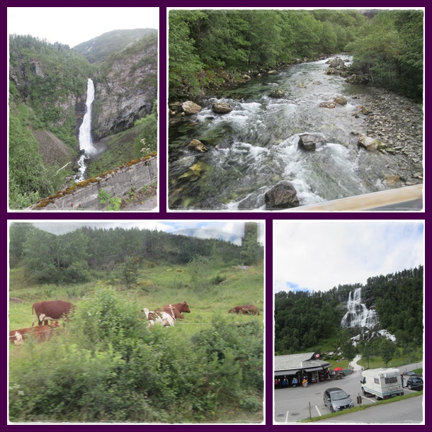 Kami juga melewati air terjun besar, sungai, dan sapi2 yang merumput. Perjalanan selama 1 jam lebih ini tidak terasa membosankan sama sekali. Mungkin karena kami baru berangkat dari Flam tadi pagi. Namun jika membayangkan peserta tour NiN yang perjalanan nya non-stop alias dikebut seharian dari Oslo ke Bergen, rasanya sih bakal ketiduran di bus karena terlalu letih. Rugi banget ya ga lihat pemandangan keren ini.