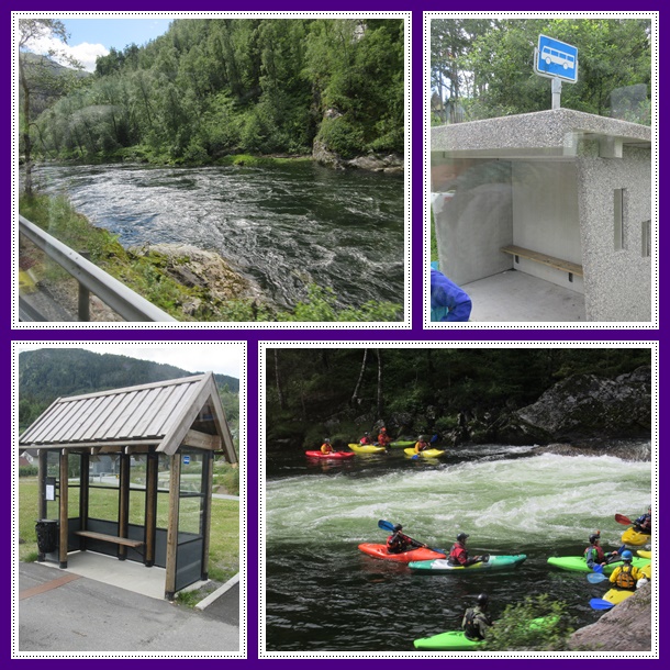 Ketika bus melewati dan menyusuri sungai, banyak orang yang melakukan aktivitas olahraga dengan kayak. Di Norway kayak itu sepertinya olahraga umum yang digemari semua orang saat musim panas. Mendekati Voss, bus berhenti beberapa kali di beberapa halte kecil mungil. Rupanya ada penumpang yang mau naik bus ke Voss. Ooh, bus ini walau untuk turis, namun masih berfungsi juga untuk transportasi warga lokal sehari-hari.