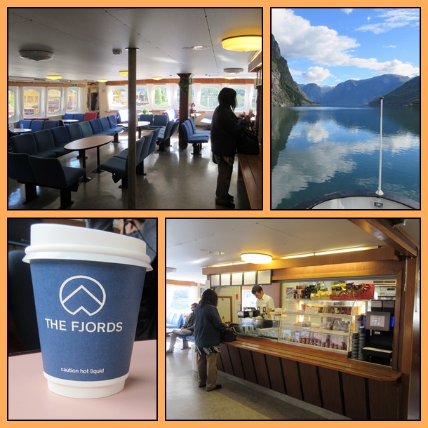 Akhirnya setelah survey kondisi ferry, kami menemukan tempat yang sangat istimewa. Lokasinya sangat strategis, dan ini dijamin tidak akan kedinginan ! Yup, kami duduk di tengah2 area café, kursi paling depan menghadap pemandangan yang cantik banget ! The best spot for us. Sambil menikmati pemandangan, kami membeli hot chocolate seharga NOK.39.