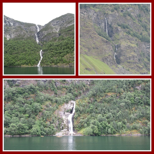 Sepanjang perjalanan kita juga bisa melihat air terjun yang tercipta karena lelehan gletser di puncak gunung. Ini juga pemandangan khas Fjord. Umumnya sangat panjang dan berliku2 dari atas ke bawah. Karena summer, air terjun nya lebih kecil2 dan sedikit, es nya sudah banyak yang cair. Namun di musim yang berbeda, ketika es masih banyak, maka air terjun yang ada akan lebih banyak dan lebih deras airnya.