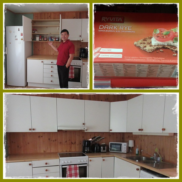 Pintu masuk kami dari belakang rumah. Begitu masuk, belok kiri ada dapur lengkap dengan peralatan makan bahkan bahan untuk memasak seperti olive oil (untuk minyak goreng), bumbu masak, beberapa dressing, berbagai selai (buah dan coklat), kopi dan gula. Bahkan mereka menyediakan biskuit yang renyah tanpa rasa, yang umumnya digunakan oleh penduduk lokal Norway untuk makan (pengganti roti). Namanya ‘Knekkebrød’ atau ‘crispbread’. Jadi penghuni hostel bisa sarapan gratis, keren banget.