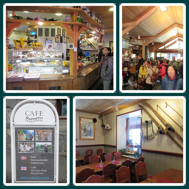 Kami dan sebagian kecil penumpang lain, sesuai dengan itinerary yang sudah dibuat, santai2 dulu di sini sambil menikmati dinginnya Myrdal. Menunggu kereta selanjutnya yang masih sekitar 1 jam, kami duduk2 di cafe saja. Interiornya menarik. Sebetulnya hanya duduk dan tidak beli apa pun tidak masalah. Di cafe ini hanya jual snack ya, jadi tidak ada makanan berat. Kami beli hot chocolate seharga NOK.30 dan grilled hot dog seharga NOK.40. Enak banget rasanya pas dingin2 dan lumayan lapar.