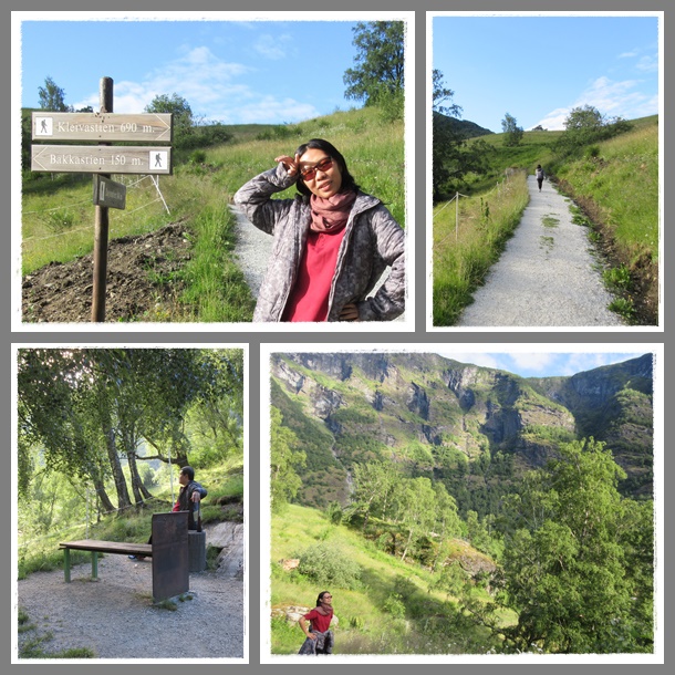 Jalurnya sangat mudah dan jelas, ga bakal nyasar. Kami tidak bertemu siapa2 di jalur pendakian kami. Asik juga, apalagi kami menikmati keindahan pagi yang luar biasa. Di beberapa titik sudah disediakan kursi tempat untuk bersantai menikmati pemandangan kota Flam di bawah dan Fjord di kejauhan. Betul2 kami merasa kecil di tengah gunung2 yang ada di Flam ini.