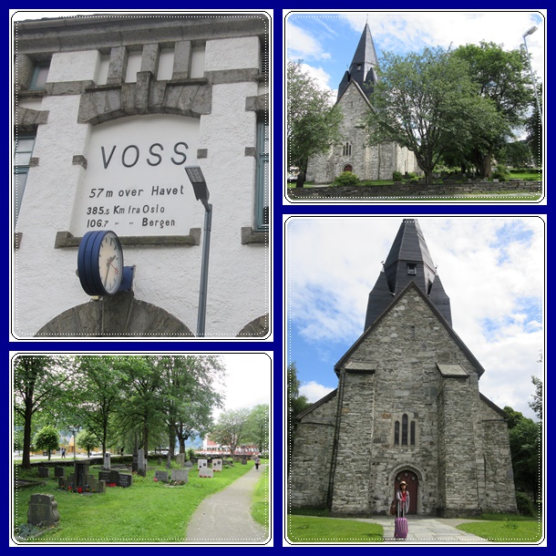 Bus berhenti tepat di depan stasiun kereta Voss. Tiket kereta belum kami beli, jadi santai dulu deh jalan2. Pemandangan danau cantik ada di depan stasiun. Tidak jauh dari stasiun ada hotel yang sangat besar. Kami sempat jalan ke arah pusat kota. Namun karena harus menggeret2 koper dan ga tahu apa yang menarik di Voss, maka kami hanya berjalan sampai ke sebuah gedung gereja di tengah jalan. Sayang, gereja ini pintunya tertutup, tidak bisa masuk. Di halaman ada pemakaman yang tertata rapi.