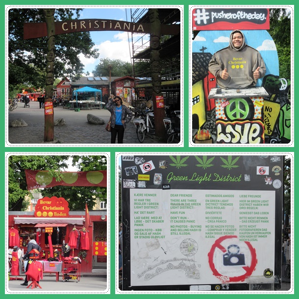 Kami meneruskan perjalanan kami ke Christiania Town, kota dalam kota. Ini daerah menarik yang perlu dikunjungi. Awalnya kaum hippies memulai kehidupannya di area ini. Namun lama kelamaan dengan makin banyaknya penduduk, area ini menjadi area khusus. Mereka tidak mau tunduk pada peraturan pemerintah kota Copenhagen. Mereka punya ‘pemerintah’, bendera (dasar warna merah dengan tiga lingkaran kuning), ada walikota, dokter, bahkan pengacara sendiri.