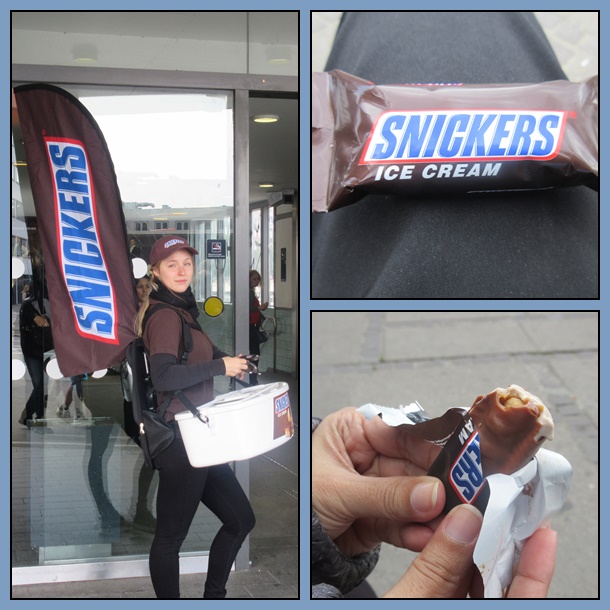 Awalnya kami mengira itu adalah coklat Snickers. Namun saat kami pegang lebih lanjut, kok terasa dingin di tangan. Pas dilihat lebih teliti, tulisannya ice cream. Wah, ternyata es krim vanilla lapis coklat ala Snickers yang belum ada di Indonesia. Rejeki memang ga kemana-mana. Ga makan es krim di menara round tower, eeh.. malah dikasih es krim gratis nih. Mantap ! Akhirnya duduk dulu di bangku dekat station dan menikmati semua es krim itu. Rasanya enaaaak banget !!