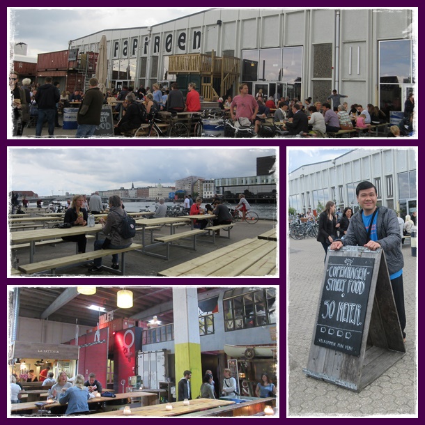 Dari jembatan kami masih harus memutar ke arah kiri dan berjalan agak jauh untuk mencapai Papirøen. Jadi ada bangunan mirip hangar yang di dalamnya berisi stall makanan. Mirip food court deh. Pengunjung bisa makan di dalam ruangan tapi juga bisa di luar ruangan. Di bagian luar bangunan, terdapat banyak sekali meja-kursi dimana pengunjung bisa bersantai makan sambil menikmati pemandangan perairan di situ.