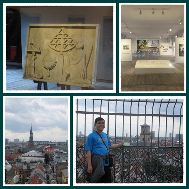 Sambil berjalan menanjak, ada jendela kecil yang bisa mengintip ke gereja trinitas tadi. Ada juga jendela2 untuk memandang kota Copenhagen. Selain itu ada juga tempat exhibition, perpustakaan (tempat HC Andersen dulu sering baca2 cari ilham), dan berbagai informasi sejarah lainnya tentang tower ini. Ada juga ruang kecil di tengah menara, dimana dasarnya terbuat dari kaca. Jadi kita bisa berdiri melayang di atas bagian dalam tower yang bawahnya lubang ini.