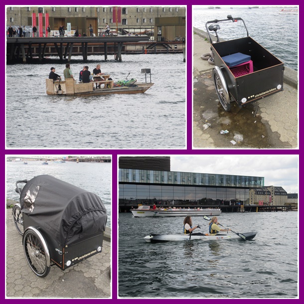 Kami makan di bagian luar gedung tentu saja. Saking banyaknya pengunjung, kami sampai harus sharing meja dengan pengunjung lain. Sambil makan kami bisa melihat ada orang-orang yang berkano, ada juga yang makan siang di atas kapal kayu terbuka, waaah seru banget itu sepertinya ! Ada juga pengunjung Papirøen yang parkir sepeda unik, namanya Christiania Bikes. Mirip becak gitu deh, bisa buat angkut barang atau bawa anaknya di dalam gerobak di depan sepeda. Pertama kali model sepeda ini diciptakan oleh pembuat sepeda di Christiania, makanya disebut Christiania Bikes. Tapi sekarang sangat banyak orang Copenhagen yang menggunakan sepeda model ini.