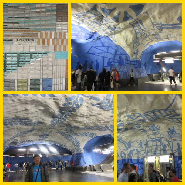 Sudah mulai kedinginan, kami pun mengarah ke T-Centralen station. Di T-Centralen station, dinding dan langit2 stasiunnya dilukis. Nuansanya biru. Beberapa station kereta bawah tanah Stockholm memang unik karena memiliki desain yang artistik. Seperti galeri saja.