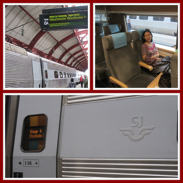 Waktu santai2 habis. Kami pun kembali ke stasiun kereta. Sekarang naik SJ train, kereta cepat menuju Stockholm. Compartment kami adalah silent compartment, bisa pilih saat booking sebelumnya. Areanya disekat dengan penumpang lain dan jumlah seatnya tidak banyak. Dan benar, selama perjalanan, semua penumpang di sini sangat silent alias sunyi senyap. Tidak ada anak kecil di area ini. Sementara di area lain, ramai dengan suara anak kecil atau percakapan antar penumpang.